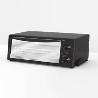 - Indicator light; baking pan, grill rack, and crumb tray included
