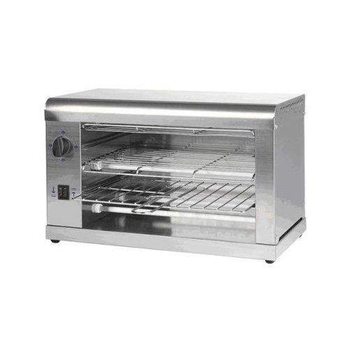 This open-face, double shelf oven perfectly toasts 12 slices of bread simultaneously, cooks pizza, reheats foods, broils, and finishes creme brulee and au gratin dishes with salamander precision. Made of brushed stainless steel. Heat and brown quickly and easily with this toaster oven. Quartz heaters for maximum efficiency and 15-minute timer. Powerful 1650-watt quartz top and bottom heating elements can be operated separately. With removable crumb tray, you will get a professional performance right in your own kitchen. Includes 2 cooking racks. Uses 110V/1650 watts. Dimensions: 12-1/2-inch by 19-1/2-inch by 11-inch.