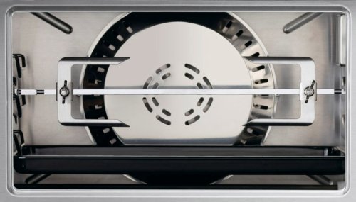 - Includes 2 baking racks, drip tray, and rotisserie spit with skewers and hand grip