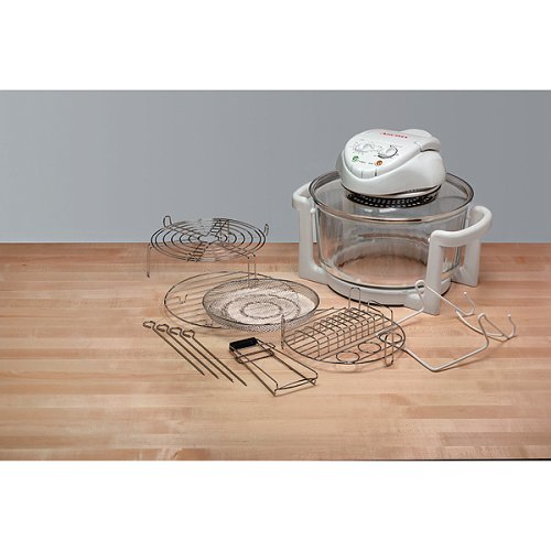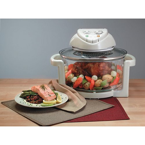 - Multifunction convection oven bakes, broils, fries, boils, grills and steams—all in a see-through pot made of break-resistant glass- Easy-to-use, accessible dials on top control the settings