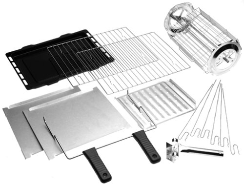 Housed in stainless steel, the oven features a tempered safety glass door with a comfortable, heat-resistant handle. The interior comes with an automatic light and a self-cleaning coating that wipes down easily. Accessories include two cookie sheets, two wire racks, a rotisserie wheel, a rotisserie handle, a broiler rack, a crumb tray, a tray/rack handle, a drip pan with a porcelain enamel finish, a fish basket, and six rotisserie skewers. Power-cord hooks and side handles simplify transport. The oven measures 15 by 23 by 13 inches and comes with a one-year limited warranty. --Emily Bedard